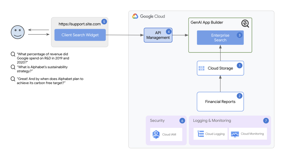 The solution uses Vertex AI Agent Builder as its core component. With Vertex AI Agent Builder, even early career developers can rapidly build and deploy chatbots and search applications in minutes.