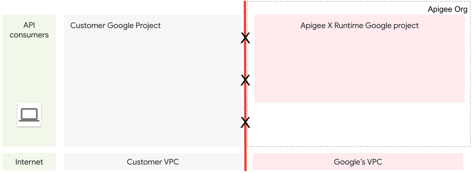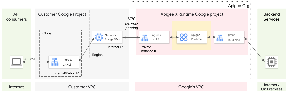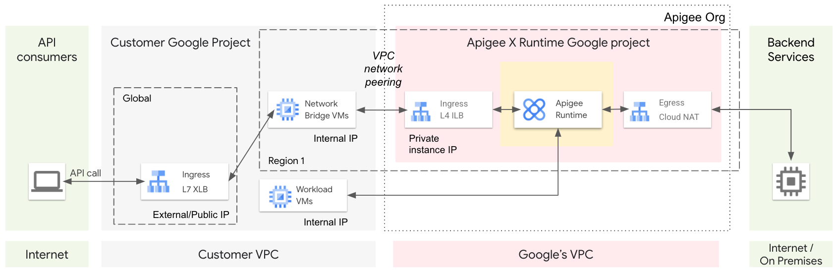 - L'équilibreur de charge externe envoie la requête à une machine virtuelle (VM). La VM sert de passerelle entre votre VPC et le VPC de Google (géré par Apigee).