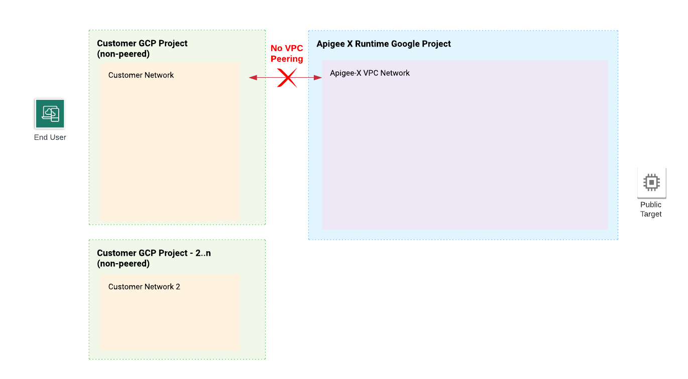 Cette section décrit l'architecture système Apigee lorsqu'Apigee n'est pas provisionné avec l'option d'appairage de VPC.
