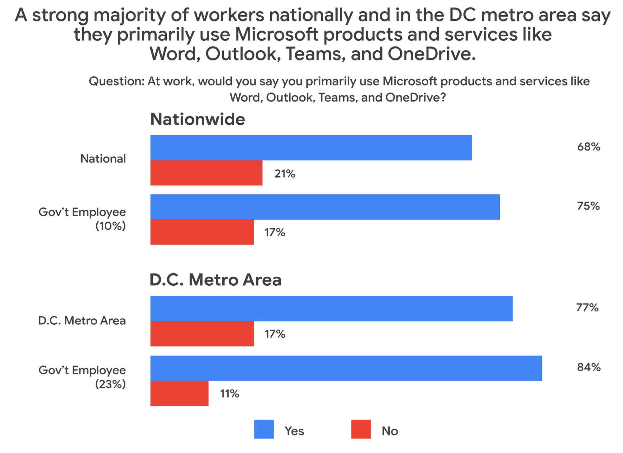 According to survey respondents, 84% of D.C. metro government employees primarily use Microsoft products at work, including Word, Outlook, Teams, and OneDrive. This is confirmed by another recent study by Omdia that found 85% of government employees use Microsoft productivity software, far and away the largest IT productivity vendor by market share.