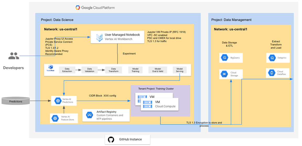 Secure and enable Vertex AI platform as your end to end ML/AI platform for production workloads.