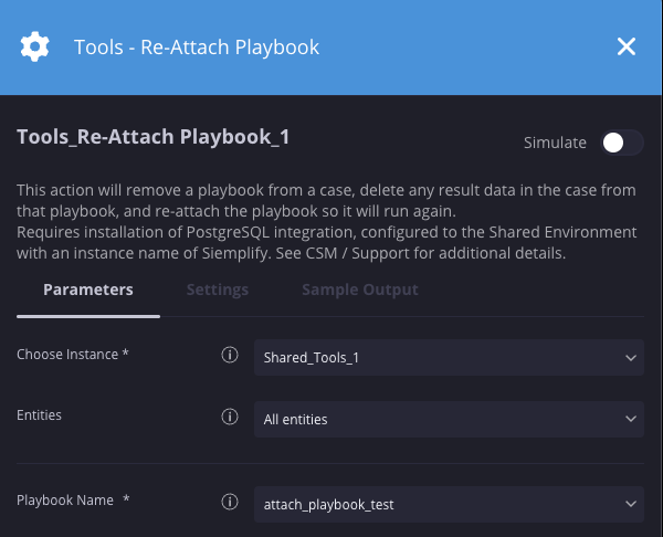 Remove um playbook de um caso, exclui todos os dados de resultado do caso desse playbook e anexa o playbook novamente para que ele seja executado de novo. Requer a instalação da integração do PostgreSQL, configurada para o ambiente compartilhado com o nome de instância "Chronicle SOAR". Consulte o CSM / Suporte para mais detalhes.