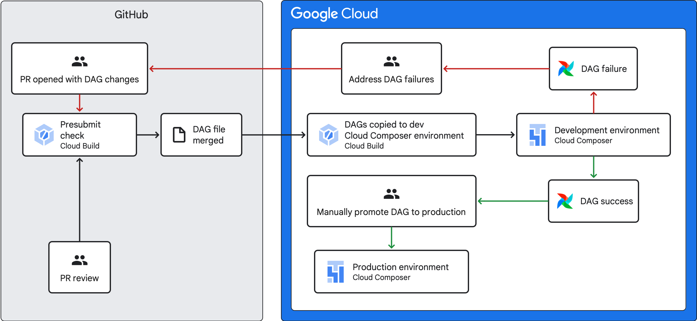 - 使用 Cloud Build 執行自動預先提交檢查。這項檢查會針對 DAG 執行單元測試。