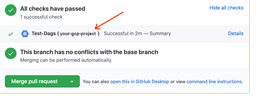 在提取要求中,按一下「詳細資料」,然後選擇「在 Google Cloud Build 中查看更多詳細資料」,即可在Google Cloud 控制台中查看建構作業記錄。您可以使用這些記錄檔,協助偵錯 DAG 問題。解決問題後,請提交修正內容並推送至分支。預先提交檢查會再次執行,您可以使用記錄做為偵錯工具,繼續疊代。