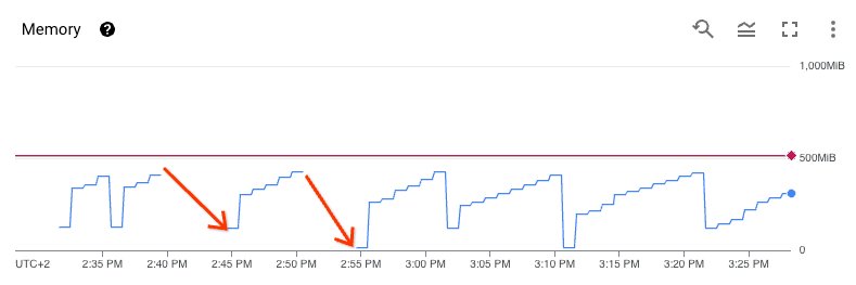 指標中查看延遲工作數量,該指標也會顯示在環境的 Monitoring 資訊主頁上。每個觸發事件都會建立一些資源,例如連線至外部資源,這些資源會消耗記憶體。