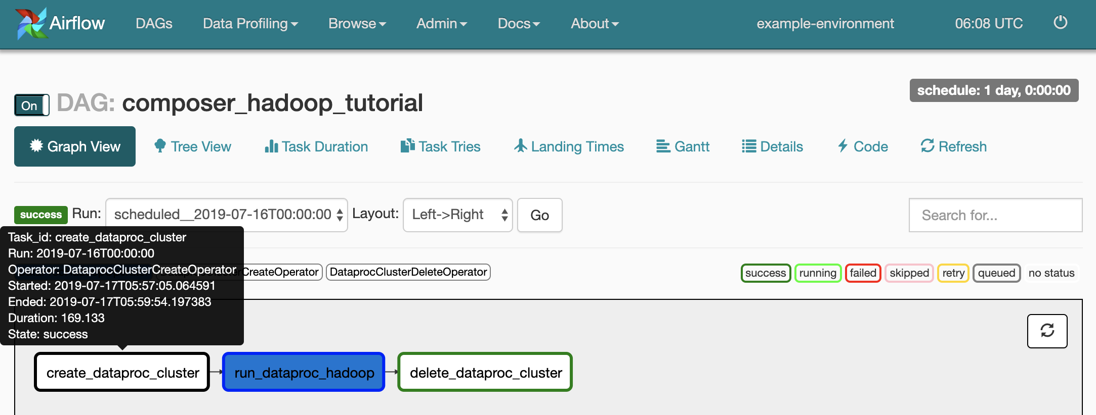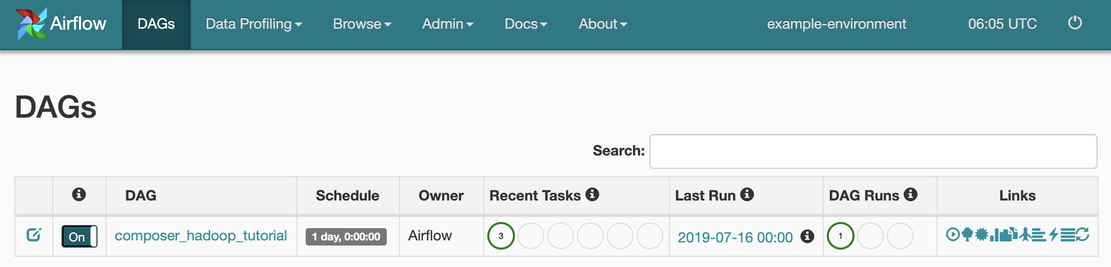 Cloud Composer 會將 DAG 新增至 Airflow,並自動排定 DAG 的執行時間。DAG 會在 3 到 5 分鐘內產生變化。