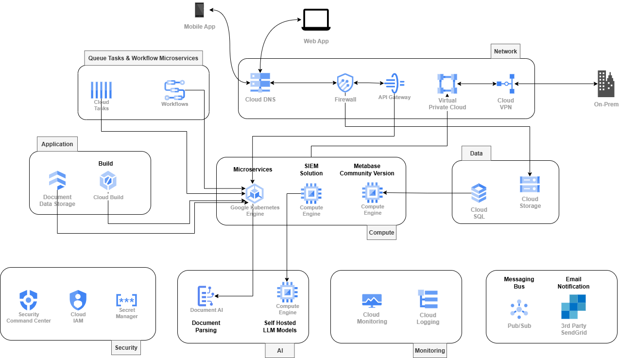 To solve the challenge of cross-border expansion with a lean team, Abhi selected Google Cloud to host its development, Quality Assurance (QA), and security workloads. The team built its solution around a core principle: maximize automation. The foundation of this strategy is a serverless architecture that uses self-managed services for compute, storage, and databases. This approach minimizes the need for active system monitoring and allows operations to run smoothly, freeing the team from routine infrastructure management.