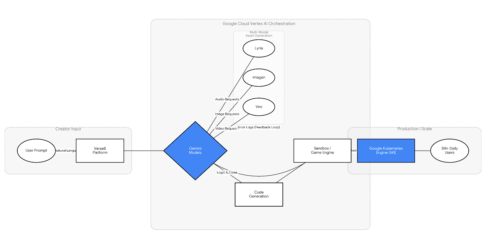 Crucially, the platform solves the hallucination problem often associated with AI coding. If the generated code contains a bug, the system runs the game in a sandbox, captures the error logs, and feeds them back into the LLM. The model reads the error, self-corrects the code, and redeploys the game automatically. To ensure this resource-intensive orchestration scales for three million daily users, Verse8 relies on Google Kubernetes Engine (GKE) to manage the massive compute load dynamically.