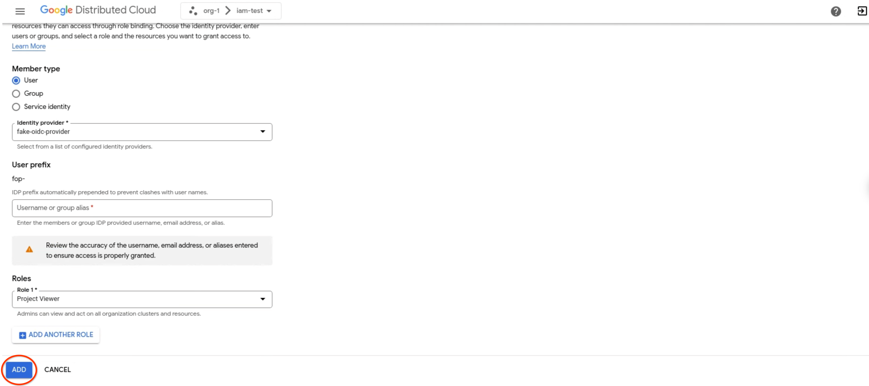 gdcloud projects add-iam-policy-binding PROJECT \ --member=USER_ACCOUNT \ --role=ROLEGanti variabel berikut: