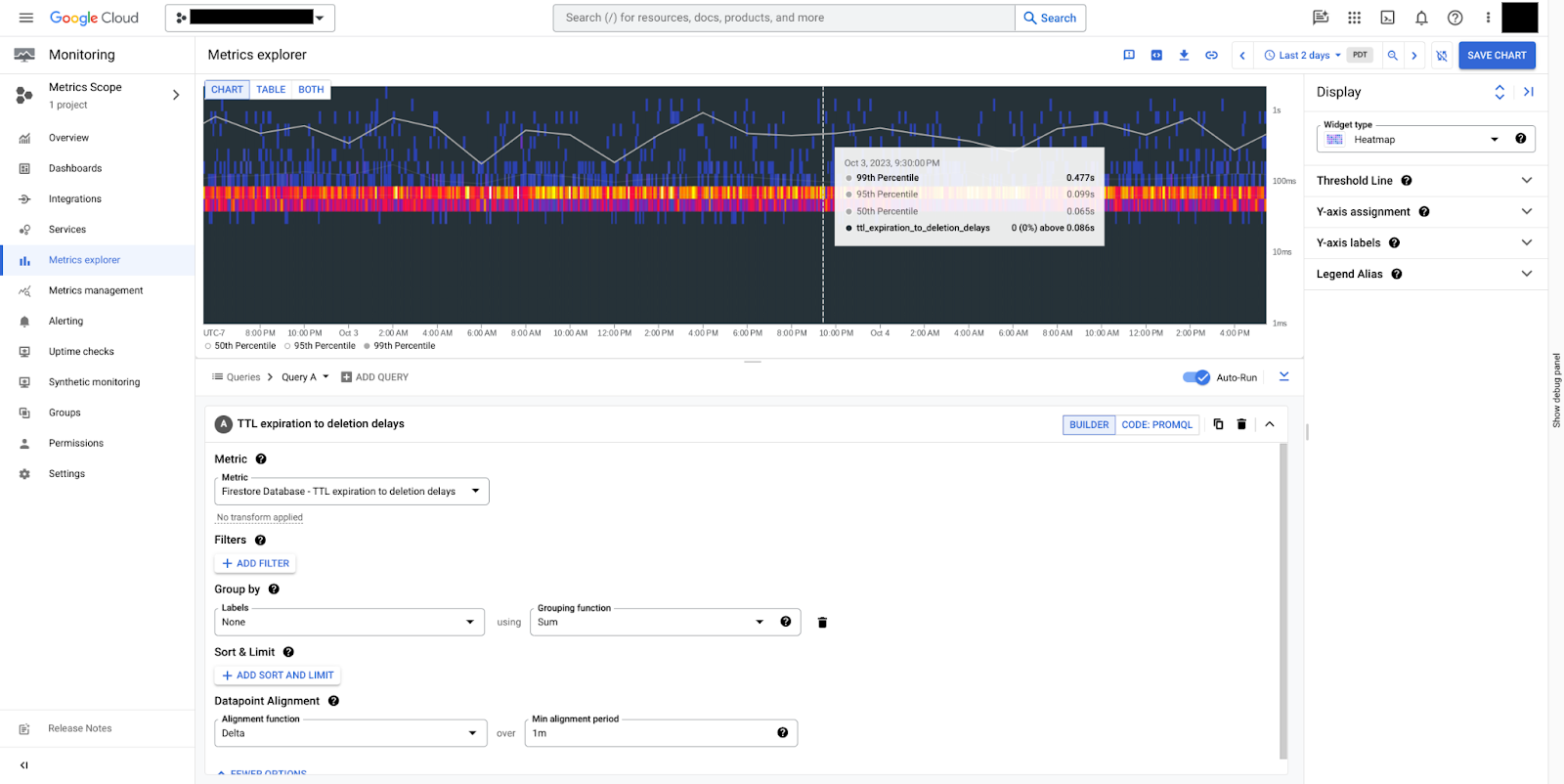 그림 10에서 이 측정항목은 Firestore가 TTL 정책이 있는 문서를 삭제하는 데 걸린 시간(초)의 분포를 제공합니다. 99번째 백분위수에서 TTL 만료 문서를 삭제하는 데 0.5초 미만이 걸립니다. 이는 시스템이 정상적으로 작동하고 있음을 의미합니다. Firestore는 일반적으로 24시간 내에 만료된 문서를 삭제하지만, 이는 보장되지 않습니다. 24시간 이상 걸리는 경우 지원팀에 문의하세요.