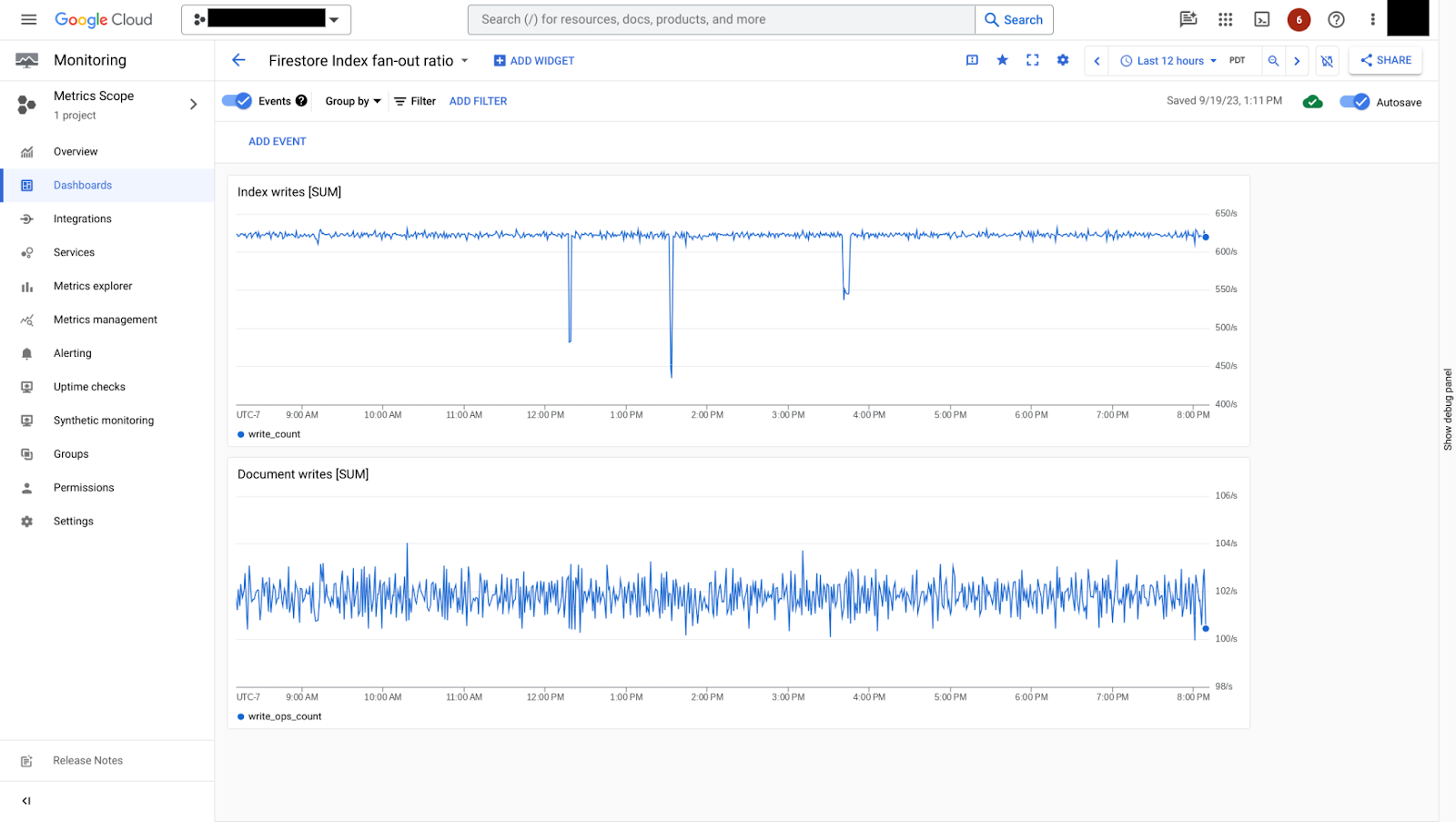 그림 7에서 색인 쓰기 속도를 문서 쓰기 속도와 대조하는 방법을 확인할 수 있습니다. 이 예시에는 모든 문서 쓰기에 약 6개의 색인 쓰기가 있으며, 이는 비교적 낮은 색인 팬아웃 속도입니다.