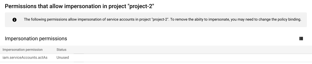 :回報服務帳戶在其他專案中模擬服務帳戶的能力詳細資料。這個欄位包含下列元件:hasPermissionUsageData