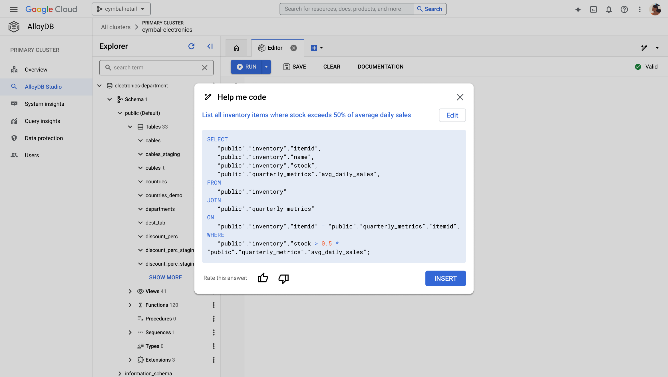 Generate, understand, and optimize SQL code using natural language instructions directly in Database Studio. Use "Help me code" to ask Gemini to generate SQL statements that work with your schema.