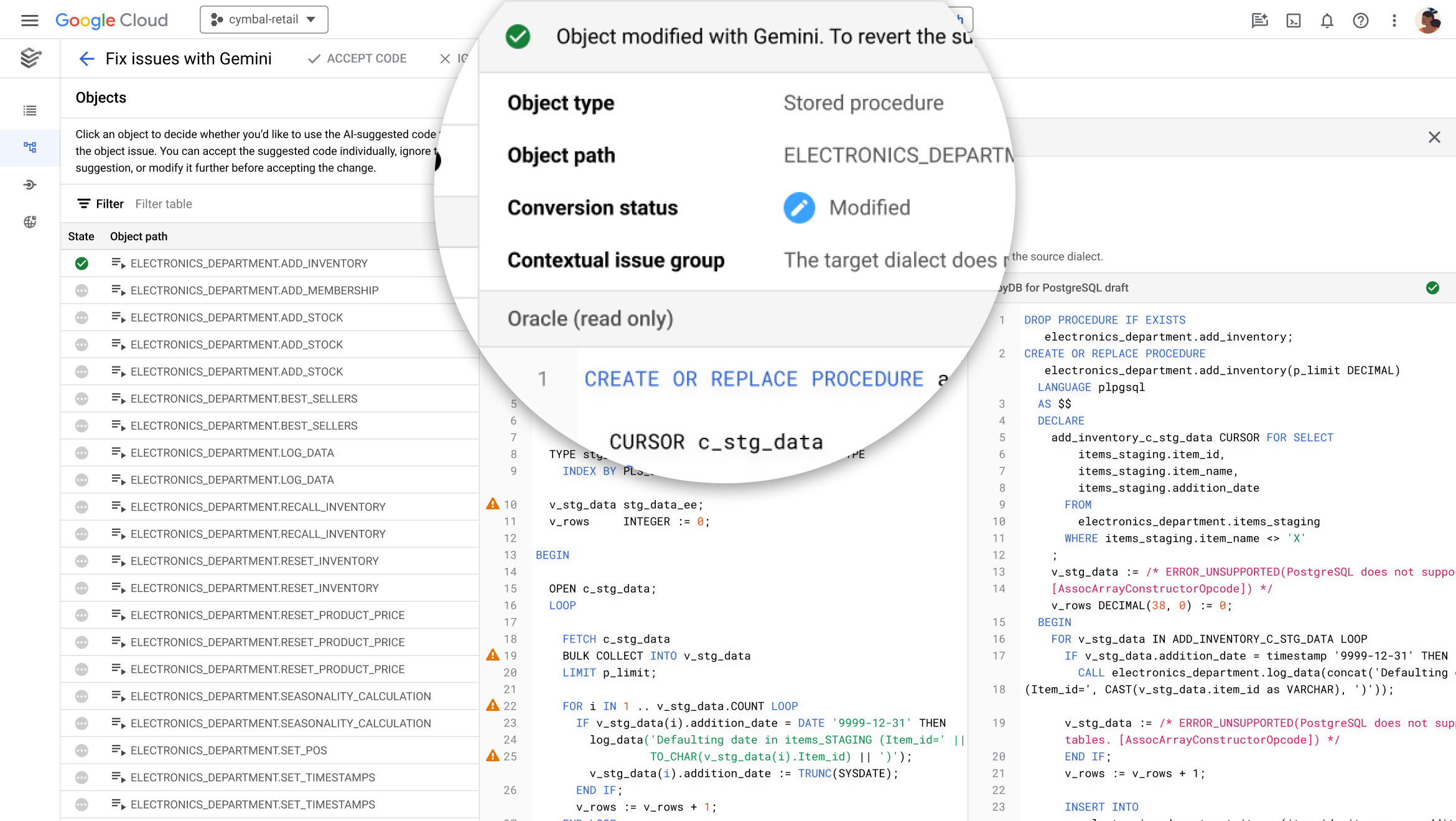 With Gemini enabled, database administrators and developers can examine and convert database-resident code such as stored procedures, triggers, and functions, to a PostgreSQL-compatible dialect. The explainability feature helps developers easily learn new PostgreSQL dialects and optimize SQL code.
