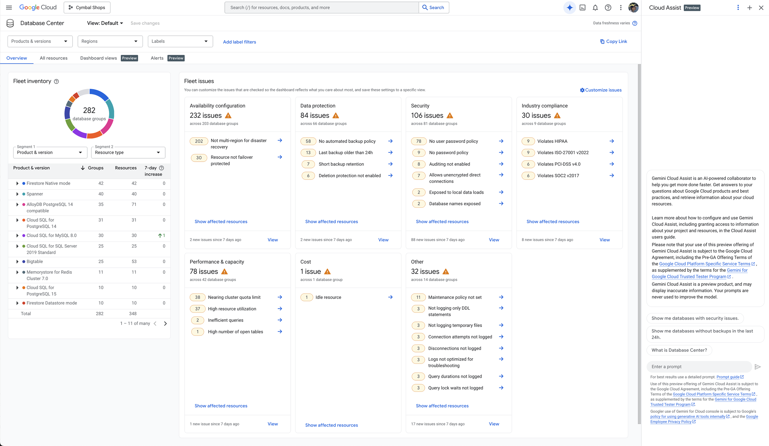 Database Center provides intelligent dashboards that proactively assess availability, data protection, security, and compliance across your database fleet, and offers recommendations to fix issues.