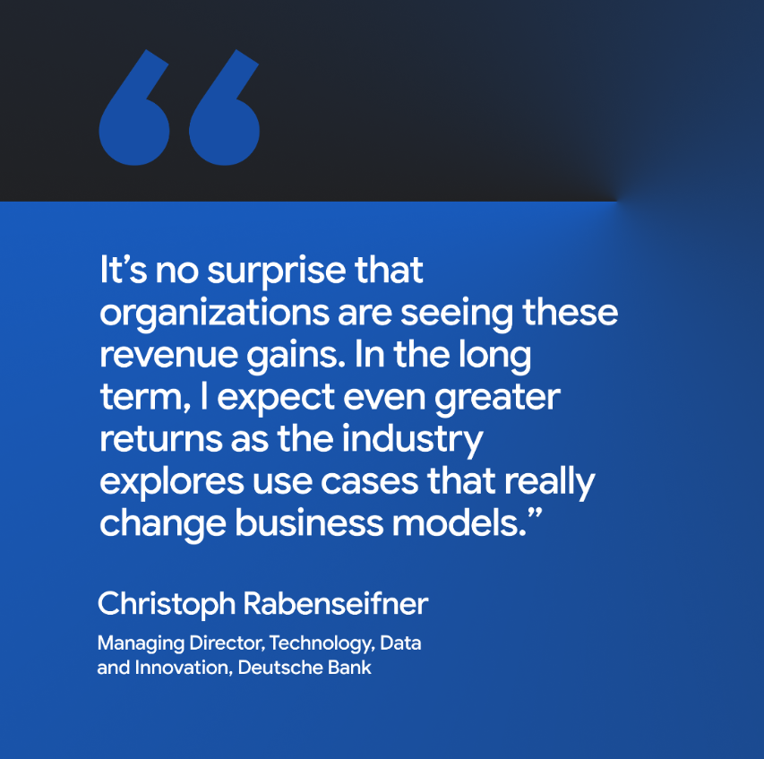 Across the financial sector, 77% of executives that use gen AI in production are currently seeing ROI on at least one use case.
