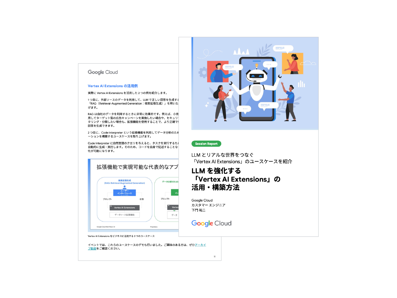 「Vertex AI Extensions」を利⽤することで LLM を API に接続し、リアルタイムなデータ取得と現実世界のアクションという特⻑をもつ⽣成 AI が可能になり、企業は⾃社のアプリケーションを強化することができます。Google やパートナーが提供するエクステンション(拡張機能)の活⽤⽅法から、開発者が独⾃の拡張機能を構築、管理、デプロイする方法を紹介します。