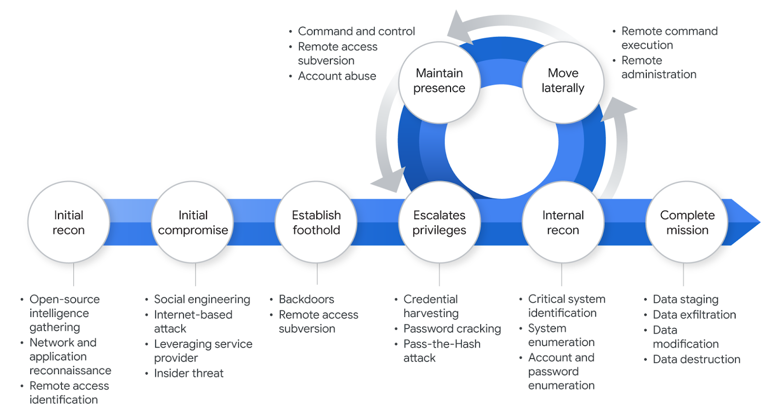 Mandiant’s depiction of the targeted attack life cycle illustrates the major phases of a typical intrusion. While not all attacks follow the exact flow of this model, the chart below provides a visual representation of the common attack life cycle.